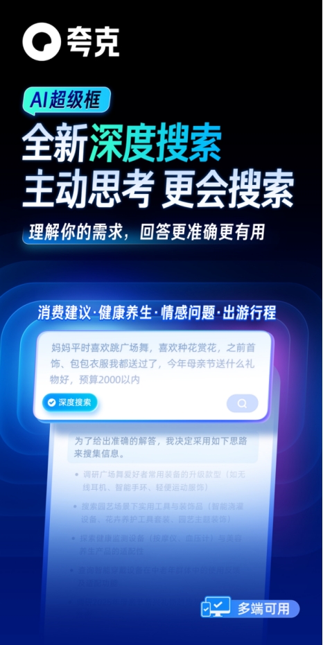 5月8日消息,夸克升级AI超级框,全新发布“深度搜索”产品。