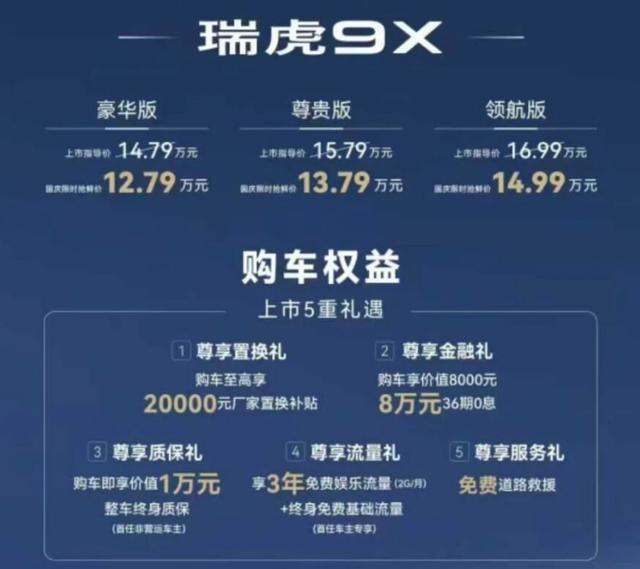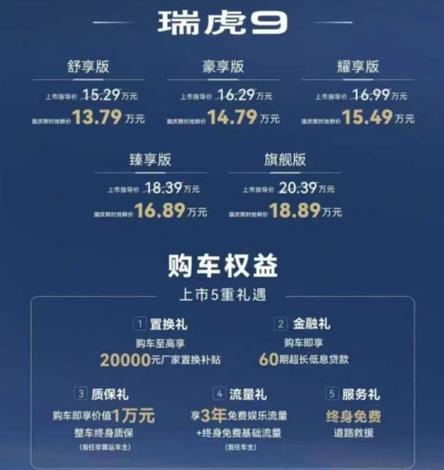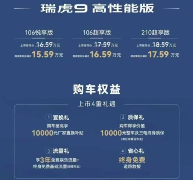 从价格区间看,瑞虎9系列的官方指导价从15.29万元起,精准覆盖了15-20万级SUV市场,满足了不同预算消费者对高品质燃油车的需求。此外,瑞虎家族还推出了国庆限时抢鲜价。其中瑞虎9X为12.79万元起,瑞虎9国庆限时抢鲜价13.79万元起,瑞虎9高性能版国庆限时抢鲜价15.59万元起。