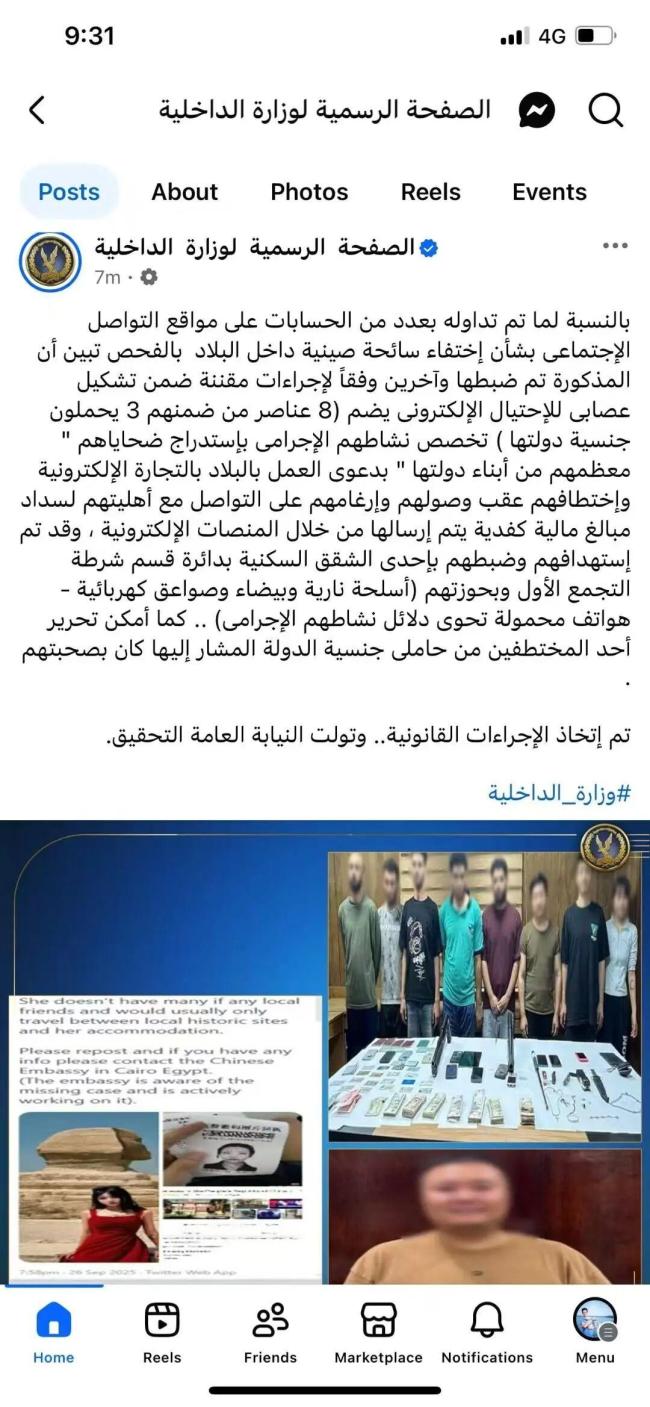 失联中国女孩诱骗同胞已被捕 诈骗团伙落网!埃及内政部官方社交账号于北京时间9月30日凌晨发布通报,澄清了关于一名中国女游客在埃及境内失踪的消息。经调查,该女子与其他几人被依法控制,他们属于一个专门从事电子诈骗的犯罪团伙,共有8名成员。该团伙以在埃及从事电子商务工作为名诱骗受害者,大部分是其本国同胞,待受害者抵达后便实施绑架,并强迫他们与家人联系支付赎金。警方在第一定居点警察分局辖区的一所住宅公寓内将他们锁定并逮捕,查获了枪支、白刃武器、电击枪以及若干包含犯罪活动证据的手机。同时,一名被绑架者也已获救。
