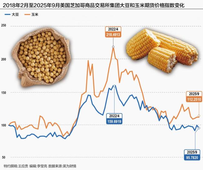 芝加哥商品交易所集团的大豆和玉米期货价格在过去几年中经历了显著波动。9月26日,大豆12月份期货价格收于1013.75美分/蒲式耳,今年价格微涨0.32%,但过去三年内下跌了28.63%;玉米12月份期货价格为422美分/蒲式耳,今年以来累计下跌7.96%,三年内跌幅达36.97%。自2022年创下历史新高以来,CME大豆和玉米期货主力合约价格指数持续呈现缓慢下跌的趋势,目前价格指数已回落至几年前的水平。