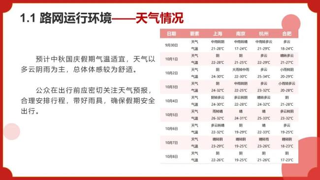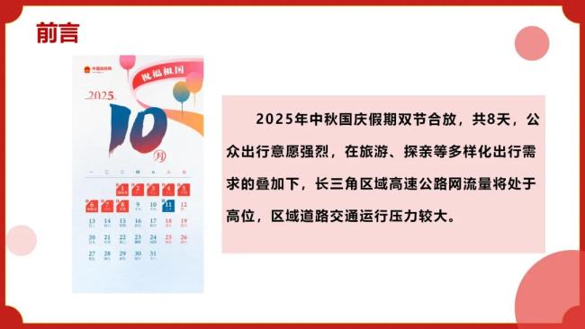 市交通委指挥中心介绍,2025年国庆中秋假期双节合放,在旅游、探亲等多样化出行需求的叠加下,长三角区域高速公路网流量将处于高位,区域道路交通运行压力较大。预计假期期间长三角地区行驶车辆总体规模有望超1...