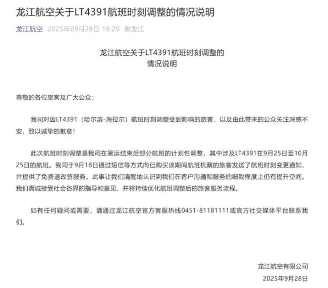 龙江航空回应提前15个小时起飞 致歉并提供免费退改签服务!9月28日,龙江航空发布了关于LT4391航班时刻调整的情况说明。声明中表示,对因LT4391(哈尔滨-海拉尔)航班时刻调整受到影响的旅客以及由此带来的公众关注深感不安,并致以诚挚的歉意。