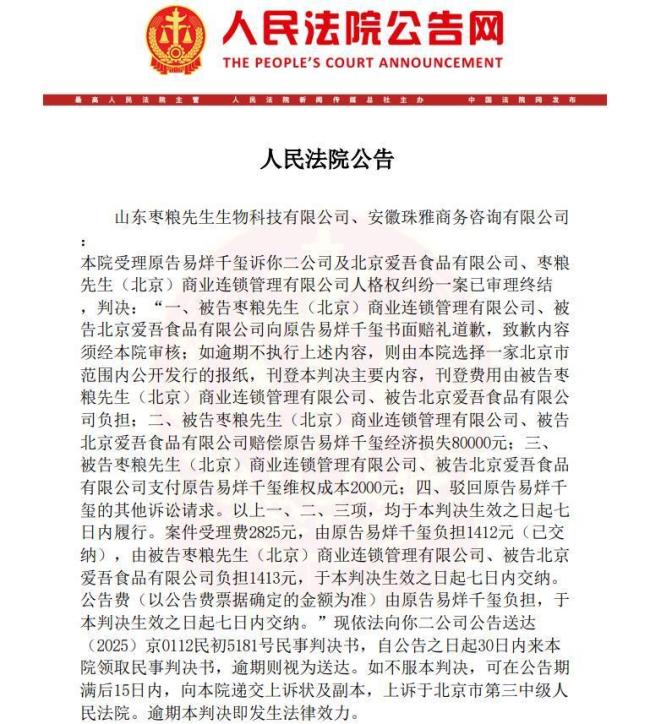 9月30日,据人民法院公告网显示,北京市通州区人民法院向山东枣粮先生生物科技有限公司、安徽珠雅商务咨询有限公司送达了易烊千玺起诉这两家公司及北京爱吾食品有限公司、枣粮先生(北京)商业连锁管理有限公司人格权纠纷一案的民事判决书。法院判决后述两家公司向易烊千玺书面赔礼道歉,并赔偿经济损失和维权成本共计8.2万元。