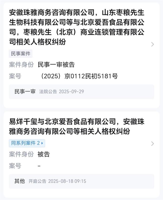 早在6月18日,通州区人民法院已向山东枣粮先生生物科技有限公司和安徽珠雅商务咨询有限公司送达传票和起诉书副本等,称该院受理了易烊千玺诉四被告人格权纠纷一案。原告要求四被告立即停止使用、销售并删除一切含有其肖像及姓名的侵权物料,终止侵权行为;要求北京爱吾食品有限公司在涉案经营场所及四被告共同在《人民法院报》上公开赔礼道歉;要求四被告共同赔偿经济损失50万元及维权成本5000元;诉讼费用由四被告承担。此案于2025年8月18日上午9时15分在通州法院第三审判区第三十二法庭开庭审理。