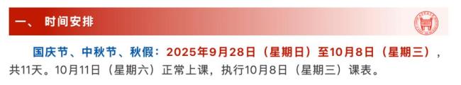 国庆将至,多所高校十一假期不调休。北京科技大学宣布2025年9月28日至10月8日放假,共11天。10月11日正常上课,执行10月8日课表。加上9月27日,该校放假天数可达12天。这一安排受到师生们的高度好评,学校工作人员表示放秋假已成为传统。