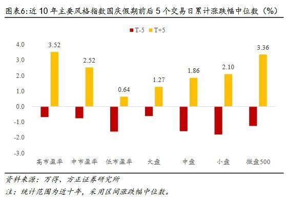 方正证券数据显示,从宽基指数角度看,A股主要股指节后表现普遍好于节前。具体而言,万得全A在国庆节前1个交易日、5个交易日的收益率中位数分别为+0.23%、-1.54%,节后分别为+0.94%、+2.20%。上证指数在国庆节前1个交易日、5个交易日的收益率中位数分别为+0.06%、-1.45%,节后分别为+0.72%、+1.41%。创业板指数在国庆节前1个交易日、5个交易日的收益率中位数分别为+0.56%、+0.47%,节后分别为+0.59%、+2.61%。