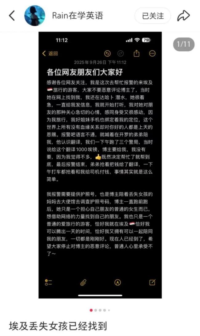 9月27日,此前在埃及失联的21岁中国女孩池女士被找到的消息引起了广泛关注。当天下午,一名在开罗当地参与寻人的中国游客表示,池女士很安全,目前被警方拘禁,具体原因尚不清楚,后续事宜已经线上转交给她的母亲。