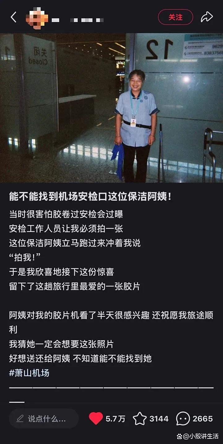 “能不能在机场上找到这位保洁阿姨?配图是一张复古的胶卷照片。”