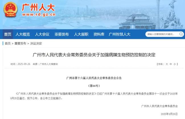 2025年9月26日,《广州市人民代表大会常务委员会关于加强病媒生物预防控制的决定》正式发布并施行。新规实施后,全市各区陆续开展专项执法行动,已有多家单位因防蚊不力被处罚。