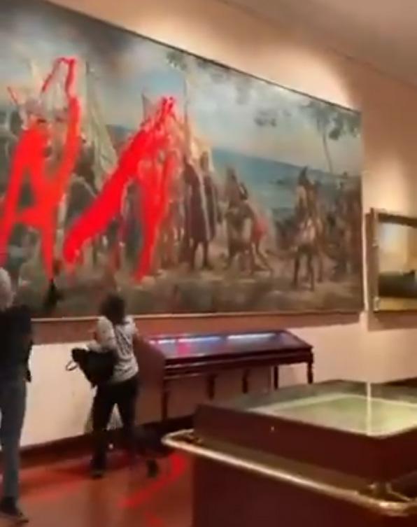 当天,两名来自西班牙环保组织Futuro Vegetal的活动人士对马德里海军博物馆一幅纪念哥伦布的画作泼洒红色油漆,抗议西班牙在这一天庆祝国庆日。他们向西班牙画家何塞·加内洛的作品《对克里斯托弗·哥伦布的首次致敬》泼洒了可降解材料制成的红色油漆。随后,两人被博物馆安保人员带走并移交给警方,面临破坏文化遗产的指控。