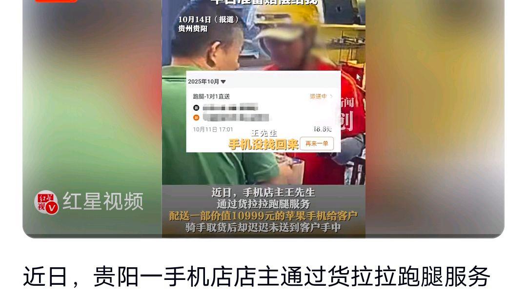 近日,贵阳一手机店店主通过货拉拉跑腿服务配送一部价值10999元的苹果手机给客户,结果骑手未将手机送达反而失联。10月14日下午,店主告诉记者,手机仍未找回,但平台已联系自己,表示将进行赔偿。