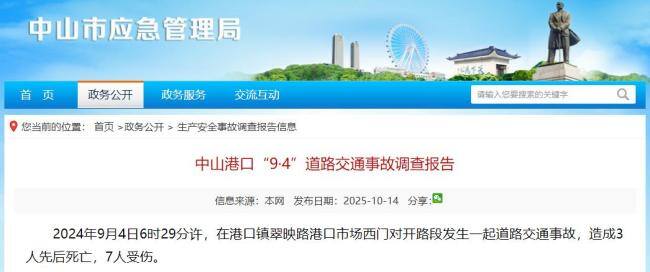 货车司机误踩加速踏板致3死7伤,广东中山公布事故调查报告 操作不当酿悲剧!广东中山市应急管理局于10月14日发布了《中山港口“9·4”道路交通事故调查报告》。报告显示,这起事故是由于车辆驾驶人操作不当,导致车辆失控并与路上人员发生碰撞造成的生产安全责任事故。