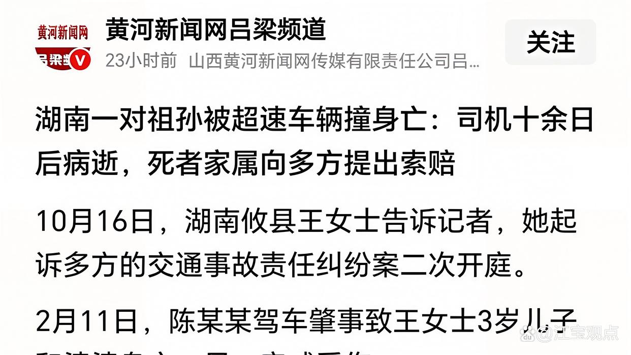 10月16日,据@黄河新闻网吕梁频道援引@新京报的报道,湖南一对祖孙被超速行驶的车辆撞身亡,而这起牵涉两条人命的交通事故责任纠纷案,已二次开庭。这件事的责任划分等没有什么好纠结的,事实非常清楚,但因为涉事的司机十余日后就病逝,因此给索赔带来了极大的难度。