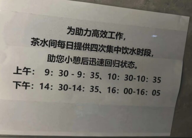 近日,有网友发帖称其所在公司对员工每日的喝水时间进行了限制,仅允许上下午各两个时段,共二十分钟可以饮水。该网友提供的通知照片显示:为助力高效工作,茶水间每日提供四次集中饮水时段,助您小憩后迅速回归状态。上午时段为9:30-9:35和10:30-10:35;下午时段为14:30-14:35和16:00-16:05。