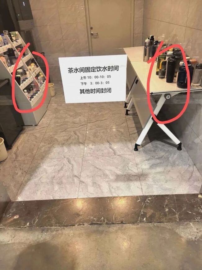 该网友还在评论区晒出另一张照片,内容是该公司此前张贴的“茶水间固定饮水时间”通知,当时仅允许上下午各一个时段饮水,总计十分钟,规定明确标注:上午10:00-10:05;下午3:00-3:05,其他时间封闭。不少网友对此表示惊讶。