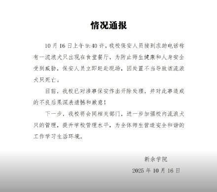 江西新余学院于10月16日发布情况通报,当天上午9点40分左右,学校保安接到求助电话,称食堂餐厅出现一只流浪犬。为防止师生健康和人身安全受到威胁,保安人员立即赶往现场处理。但由于处置不当,导致该流浪犬...