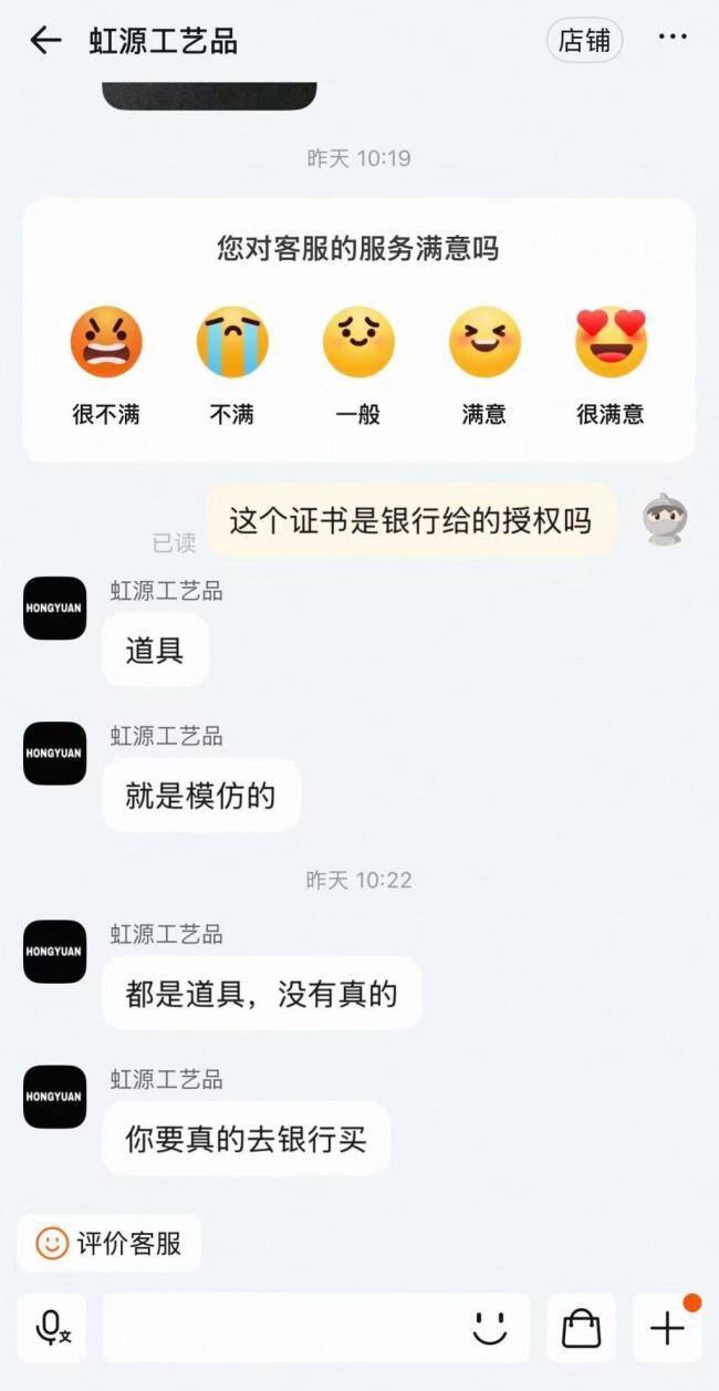 对相关“高仿金”产品是否有银行授权的问题,网店客服明确表示,无论是产品还是“合格证”均属仿制,仅作为摆件或道具使用。这类高仿金条多为“铜镀金”材质。