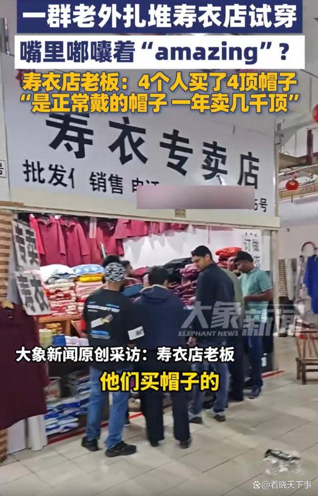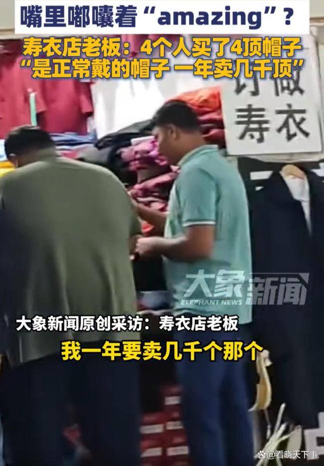 当看到游客们拿起寿衣往身上比划时,老板连忙摆手表示不卖。但游客们误以为老板要抬价,继续挑选。最终,他们看中了店里几顶老人常戴的普通帽子,买了四顶后开心地离开了。