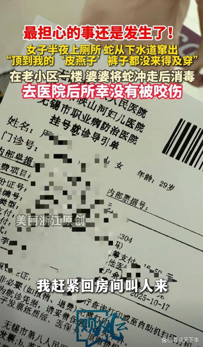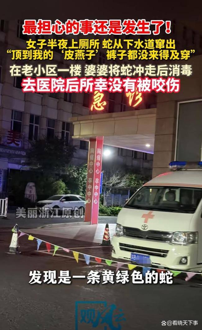 这位周女士住在老小区的一楼。当天晚上11点左右,她去卫生间上厕所,刚一坐下就感觉到有什么东西窜出来。起初她以为是自己睡迷糊了,但当真被一个东西顶到时,她瞬间惊醒。低头一看,马桶里有一条黄绿色的蛇。她连裤子都来不及提,连忙起身回屋叫人。随后婆婆赶过来,用水将蛇冲掉。事后去了医院检查,确认没有伤口,这才放下心来。