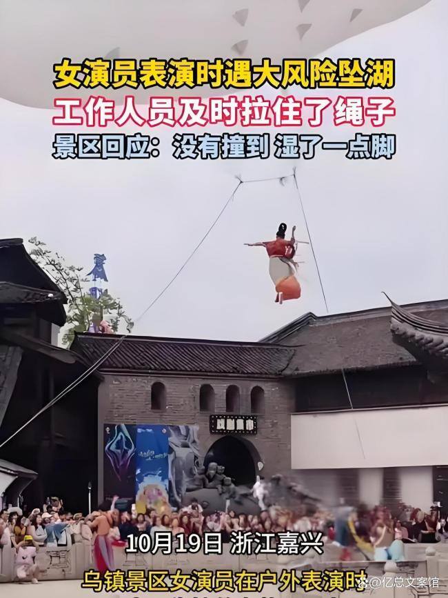 女演员高空表演时落水 乌镇回应 快速救援获赞。10月19日中午,浙江嘉兴乌镇西栅景区热门表演“扶摇飞天”突发意外。一名女演员借助气球和威亚悬浮高空表演时,因突遇横风导致设备失控,不慎落入湖中,现场游客惊呼声四起,相关视频迅速在社交平台发酵。次日,乌镇景区官方回应确认演员无受伤,涉事节目已永久停演,并表示后续将优化特殊天气表演调整机制。