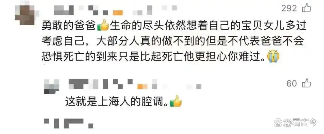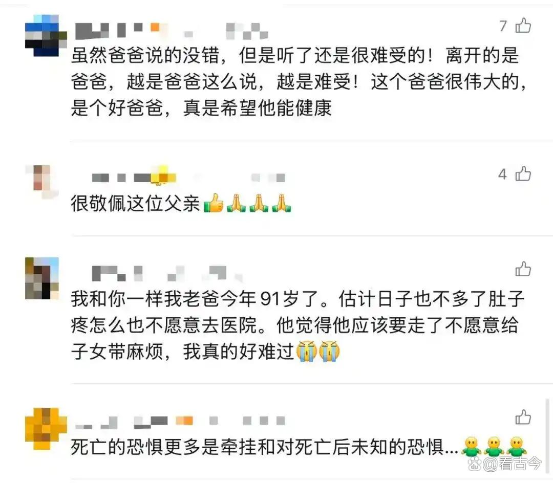 这闺女也是个妙人,把老爸的“金句”全记下来发网上,结果直接引爆热搜。有网友算账:“按3个月算,90天得听270句人生哲理,这老爸是‘人间鸡汤自动贩卖机’吧?”还有人破防:“比起死亡,他更怕闺女难过,这哪是教别离啊?分明是给闺女穿‘防弹衣’!”