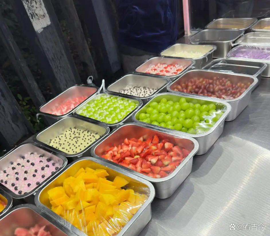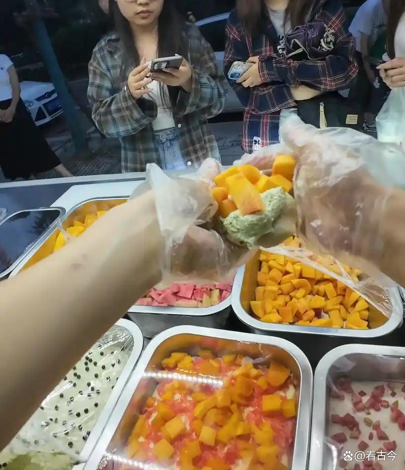 张同学刚到武汉,在汉口学院、武汉东湖学院周边的小吃街摆摊。这选址,简直太精准了,周边都是高校学生和居民,目标客群全在这儿。刚开始,他早10点就起来备料,采购、切水果、做麻糍面皮,忙得脚不沾地,晚6点才出摊。后来生意越来越火,备料时间直接提前到早7点,他妈妈也从黄冈赶来帮忙备料、打包,就为了能“每天下午5点按时出摊”。
