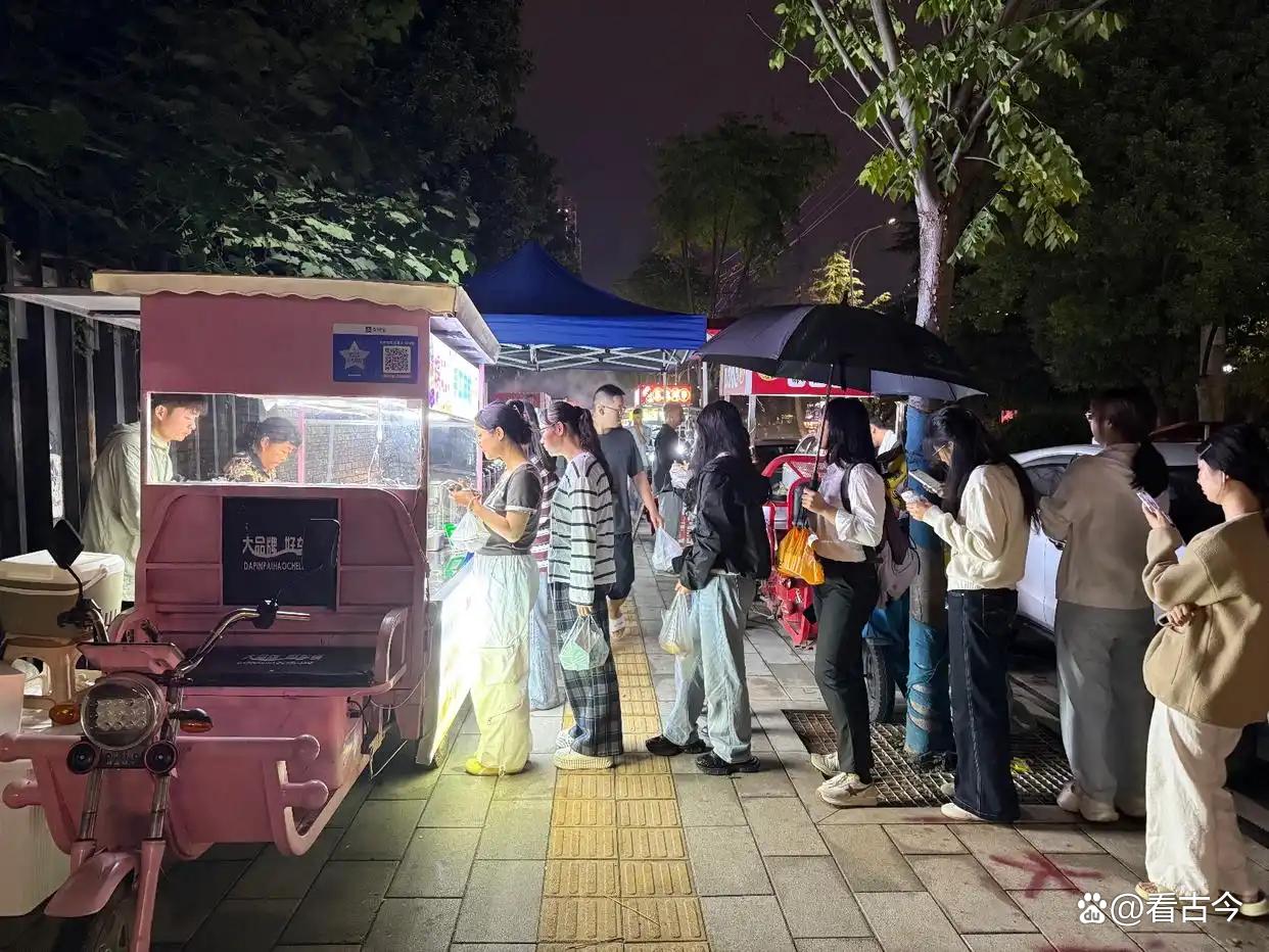 张同学这摊位,在200米左右的小吃集市里,高峰时摊前排队能有近50人。食客们评价可高了,有的说麻糍好吃,有的觉得张同学和粉色摊车特别搭,还有人顺着张同学社交媒体“张同学不是便衣”专程探摊,路上得花约半小时呢。