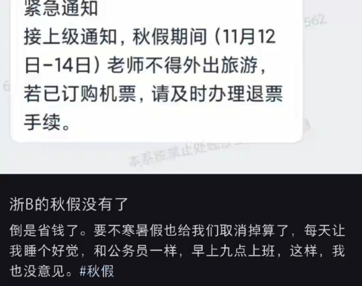 随着秋假越来越近,有网友发帖称自己是宁波的老师,接到学校通知,学生放假,但老师不放,且老师秋假期间不得外出旅游,若已订购机票及时退票。