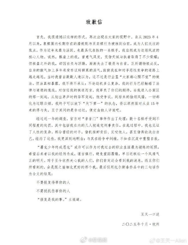 10月21日,象棋大师王天一发布致歉信,信中讲述了其在恶性竞争的道路上越走越远的心路历程。王天一称:希望后来者以我的经历为戒,谨言慎行,避免重蹈覆辙,早日还棋坛一个风清气正的明天。对于至今依然关心我的人们,你们肯定还会看到我的消息,而且你们所看到的,会是跟之前相比更好的那个我。