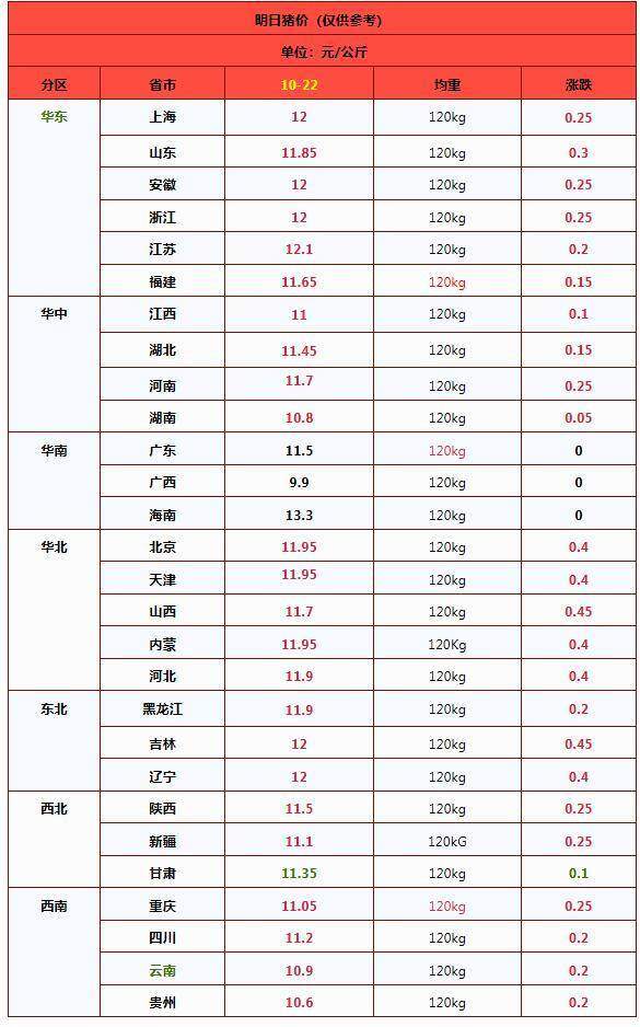 因此,在供需关系调整的推动下,短期内猪价走势或将延续上涨局面,市场不乏出现“火箭式”上涨的机会。最新消息显示,受屠宰场提价影响,预计10月22日标猪报价将回升至每公斤11.54元,上涨0.21元。后市仍需密切关注购销情绪变化,尤其是养殖端出栏节奏及二次育肥操作,这些因素都将对猪价走势产生重要影响。