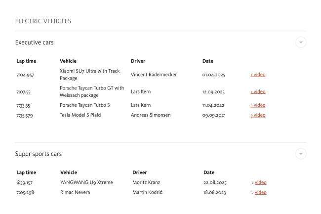 目前的纽北纯电量产车圈速榜,前三分别是:仰望 U9X、小米 SU7 Ultra、Rimac Nevera