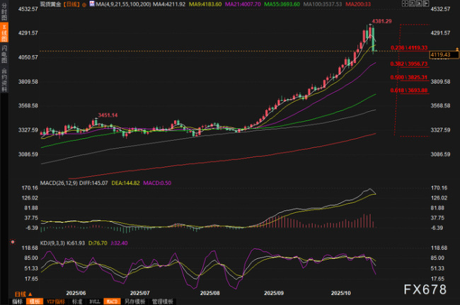 在全球金融市场动荡不安的背景下,黄金作为传统避险资产的地位再次受到严峻考验。10月21日,现货黄金价格大幅下跌,单日跌幅达到5.3%,收于4124美元/盎司,创下近一周新低,也是自2020年8月以来的最大单日跌幅。盘中金价一度触及4083.15美元/盎司的低点,较日内高点下跌近300美元,令许多投资者措手不及。这一暴跌并非孤立事件,而是多种因素交织的结果,包括投资者获利了结、避险需求减弱以及宏观经济环境的变化。今年以来,金价已累计上涨约60%,周一还曾触及纪录高位4381.21美元,但短短一天内就出现了戏剧性逆转。这场黄金“闪崩”不仅牵动着全球投资者的神经,也反映出当前国际地缘政治、经济政策和货币市场的复杂博弈。10月22日亚市早盘,现货黄金窄幅震荡,交投于4120.20美元/盎司附近。