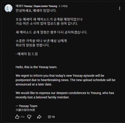 艺声经营的YouTube频道「예세이 Yessay」,制作团队今日亦宣布停更,并向艺声致意。「今天原先会公开Yessay新的小花絮,但因令人心痛的消息,所以暂停上传。新花絮的公开日往后会再通知。为送走珍贵家人的艺声表示慰问。」