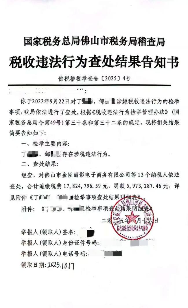 樊女士向媒体透露,她已收到税务部门出具的查处结果告知书,显示抖音网红小影夫妇及其相关公司等13个纳税人因偷逃税被广东佛山市税务局稽查局查处,合计追缴税费17824796.59元,罚款5973287.46元。