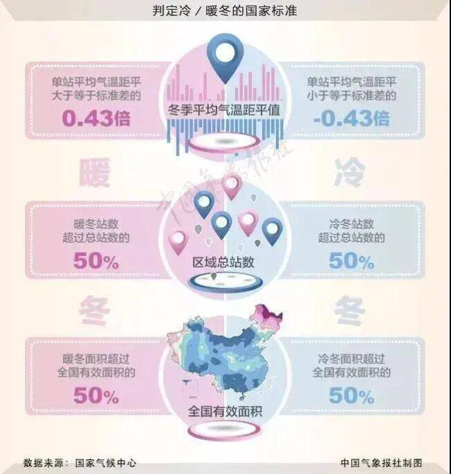 国家标准《冷冬等级》(GB/T33675-2017)和《暖冬等级》(GB/T21983-2020)对冷冬和暖冬有明确定义。根据定义,在全国范围内,超过一半的气象观测台站冬季平均气温满足冷冬或暖冬标准时,这一年冬季才会被判定为冷冬或是暖冬。简单来说,在气象界,冷暖冬不是一个预测概念,而是对冬季气温状况的事后认定。