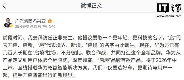 广汽集团董事长冯兴亚表示,华为已有数百人长期驻扎在“启境”项目现场,双方紧密合作,共同打造这一全新品牌。华为全程参与产品定义和用户体验设计,深度赋能。“启境”品牌的首款产品预计于2026年中上市,将全栈搭载华为乾崑智能解决方案。