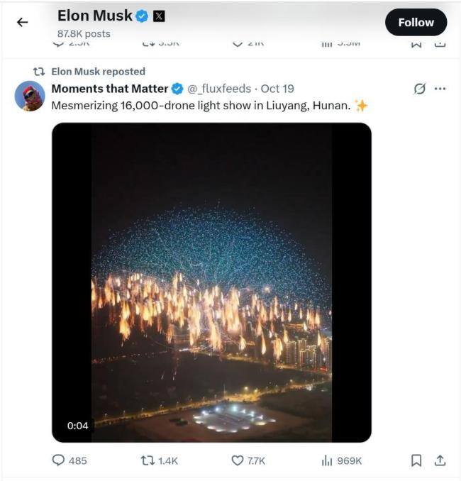浏阳烟花再次在海外引起关注。10月19日,特斯拉创始人埃隆·马斯克在推特上转发了一条关于“浏阳创意烟花与无人机共舞破吉尼斯世界纪录”的新闻,引发大量海外网友的关注和热议。