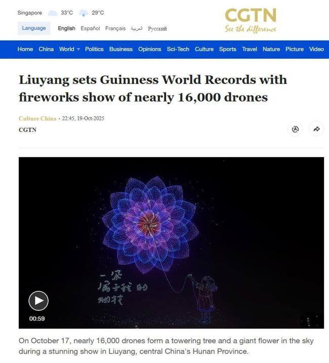 10月20日,中国国际电视台也报道了此事,称这场表演是浏阳写给世界的“光影情书”,不仅点亮了吉尼斯世界纪录,还传递给每个人一份浪漫。