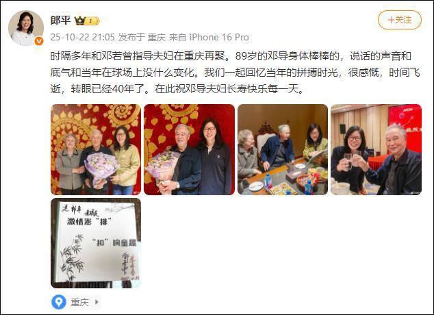 郎平与女排功勋主帅再聚 共忆往昔辉煌时光!10月22日,郎平在微博上分享了她与邓若曾指导夫妇在重庆重聚的消息。邓导今年89岁,身体状况良好,说话的声音和底气依旧如当年在球场上一样。他们一起回忆了过去拼搏的时光,感慨时间飞逝,转眼已经40年了。郎平祝愿邓导夫妇长寿快乐每一天。