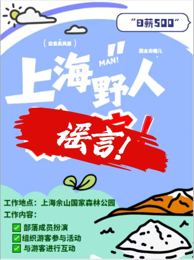 10月23日,上海佘山国家森林公园通过官方微信号发布辟谣声明,表示从未发布或授权发布招募“野人NPC”的招聘,且目前无此类招聘计划,提醒公众提高警惕。园方澄清,该信息纯属虚假,所有信息均会通过官方渠道统一发布,任何非官方渠道发布的招聘信息均无效,请不要轻信来源不明的网络招聘,谨防上当受骗。