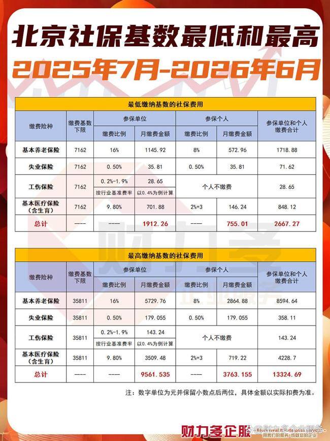 1.北京市2025年社保最低基数7162元,最高基数35811元,最低基数单位部分承担1912.26元,个人部分承担755.01元,合计2667.27元(因公司工伤比例不同会有浮动,此数据为0.4%为例);