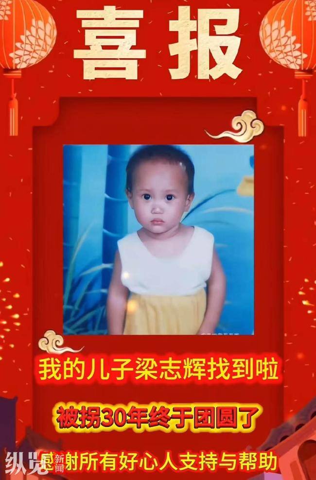 10月28日,江西赣州男子梁三寿在社交平台发布视频称,他已经找到了被拐30年的儿子梁志辉。当天下午,梁三寿证实已接到警方消息,确认寻找多年的儿子已经找到。