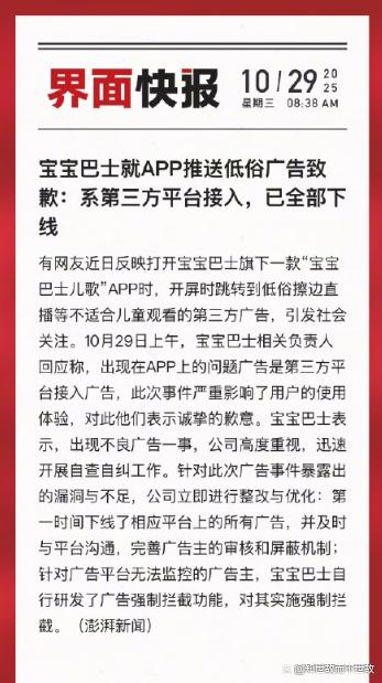 10月29日,宝宝巴士相关负责人回应称,出现在APP上的问题广告是第三方平台接入广告,此次事件严重影响了用户的使用体验,对此他们表示诚挚的歉意。