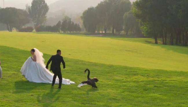 10月27日,山东济南一对新人在草坪上拍摄婚纱照时,一只黑天鹅被新娘的白色婚纱吸引,追着新娘而去。新郎见状果断上前,将黑天鹅驱离。第二天,新郎孙先生表示,当时确实有些害怕,但肯定要保护对象。