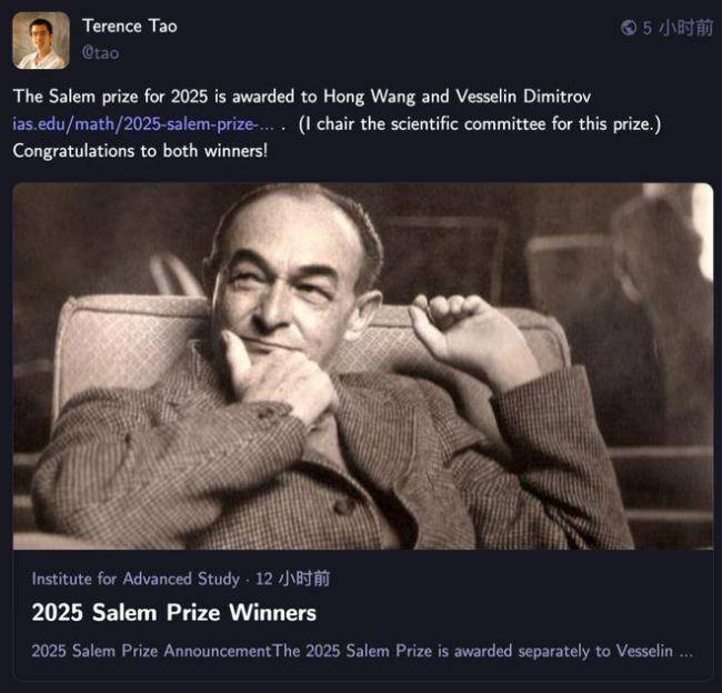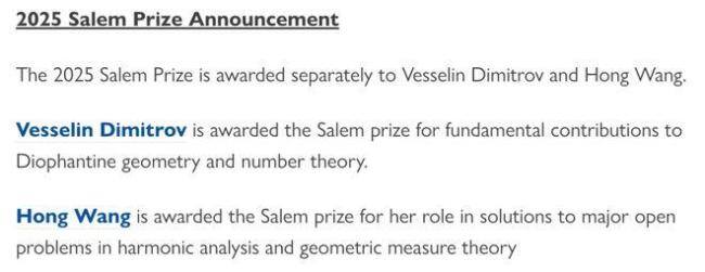 中国数学家王虹在34岁时获得了2025年塞勒姆奖,表彰她在调和分析与几何测度论领域的重大贡献。该奖项被视为菲尔兹奖的风向标。同时,加州理工学院数学教授Vesselin Dimitrov也因在丢番图几何与数论方面的基础性贡献获得同一奖项。陶哲轩对两位获奖者表示了祝贺。
