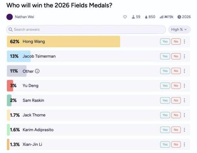 就在前一天,王虹还荣获了ICCM数学奖金奖,这一奖项被誉为华人数学界的“菲尔兹奖”。几乎在同一时间,她接连获得两大重要奖项,使她距离菲尔兹奖似乎只有一步之遥。此前,王虹曾一度登上2026年菲尔兹奖得主赔率榜首。