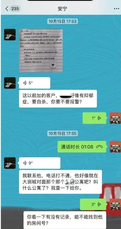 “我立刻给女孩发信息,问她好不好。她没回复。我又给她打去语音电话,也没人接。”安宁说,虽然和对方并不熟悉,但直觉不对劲,由于刚接到新的订单等待派送,他马上将信息同步给站长胡广志:“这是以前加的客户,好像有抑郁症要自杀,你要不要报警?“