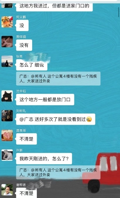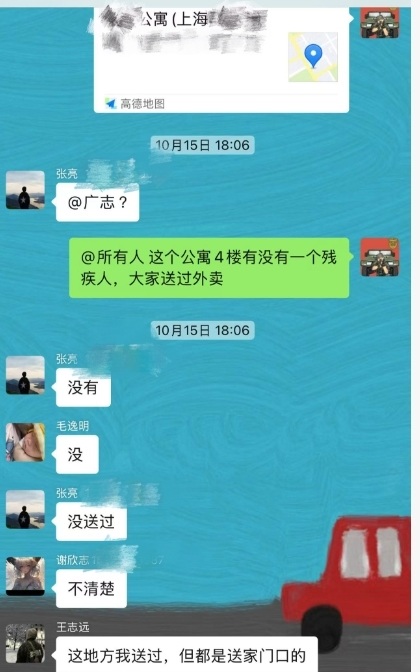消息发出后,群里的骑手们纷纷响应。大家暂时放下了手头的订单,有的开始翻阅自己的历史订单记录;有的回忆相关小区的配送细节;有的直接联系到正在该小区附近送餐的同事,希望帮忙留意……更多的细节在大家的共同努力下,一点点拼凑起来。