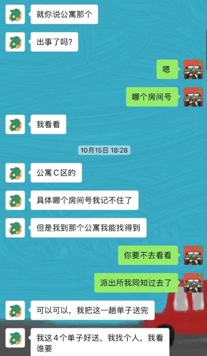 胡广志马上联系了这名骑手,建议对方去现场看一下。骑手很爽快,表示将手上的4个订单转给他人,立刻去看。