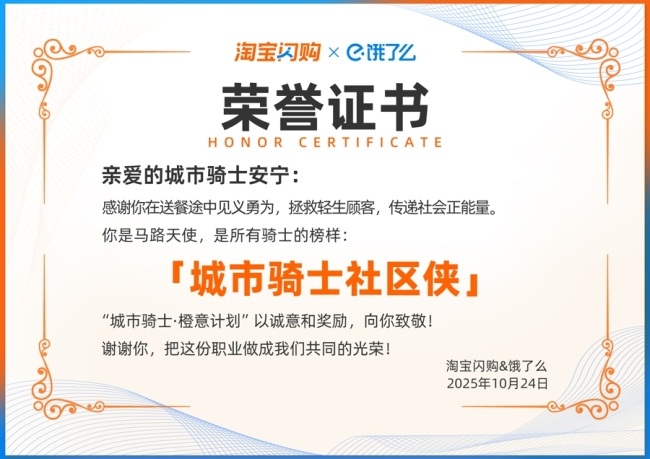 据悉,“城市骑士·橙意计划”是今年8月18日起,由阿里巴巴集团和蚂蚁集团旗下20多个业务品牌共同推出的保障激励制度,旨在进一步激发城市骑士的见义勇为、助危救困等行为。该计划覆盖所有外卖平台的骑士,不分所属平台、城市及运力形式,对骑士的爱心善举,如跳水救人、拾金不昧等、挽救轻生者等,均有荣誉和激励。